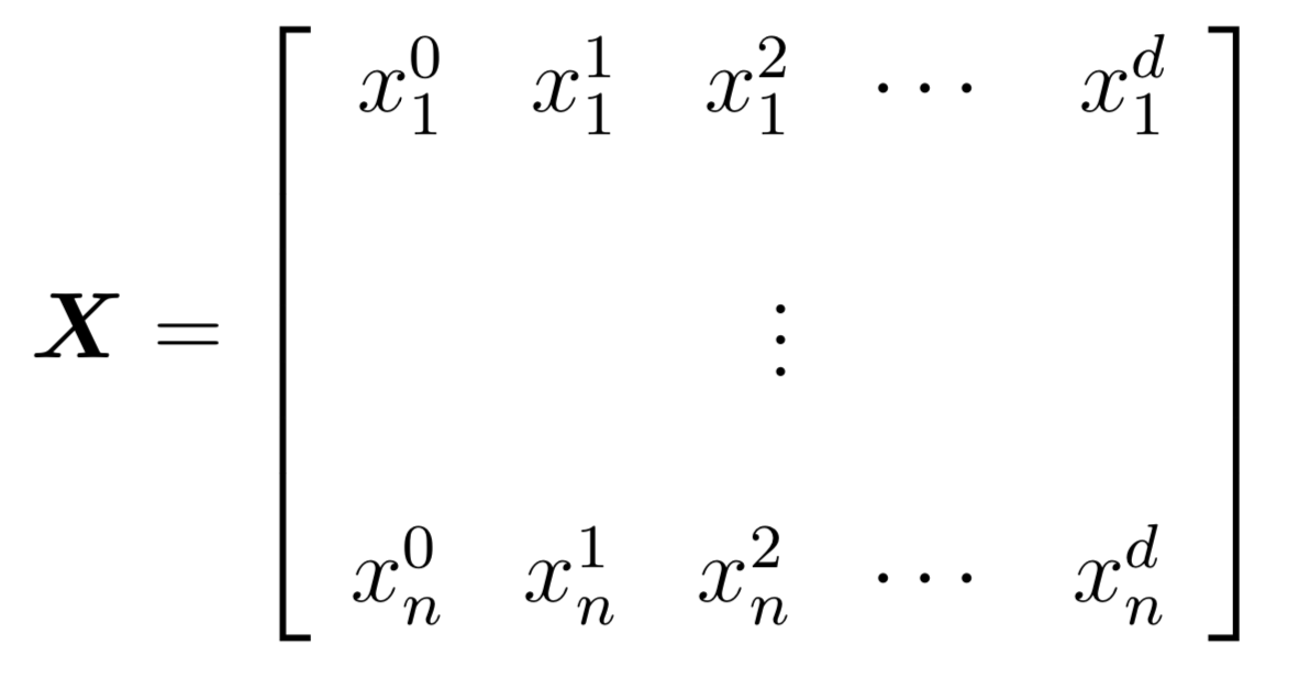 The idea is to create a matrix X where column k represents x to the power k. Here is what this might look like for a degree d polynomial: